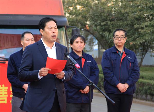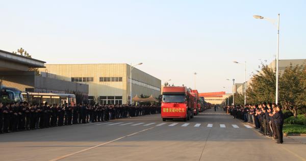 最后,發(fā)貨車輛啟動,參會人員列隊馬路兩邊,歡送滿載成品的車輛啟程。